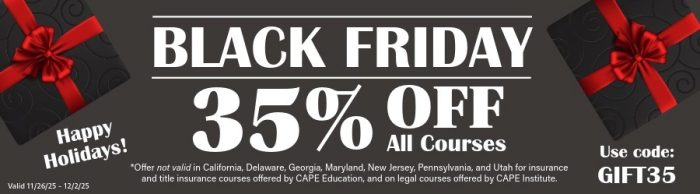 Refunds apply to tuition fees only, not shipping and materials, and are per person per event. A WRITTEN refund request must be received in our office 1 business day prior to the start of class. All refunds are subject to non-refundable administrative fees: $25 fee for CE classes and $50 fee for Pre-license classes. These fees will remain on your account for one year, and may be applied to future seminars offered by Cape. There are NO refunds for completed courses.
